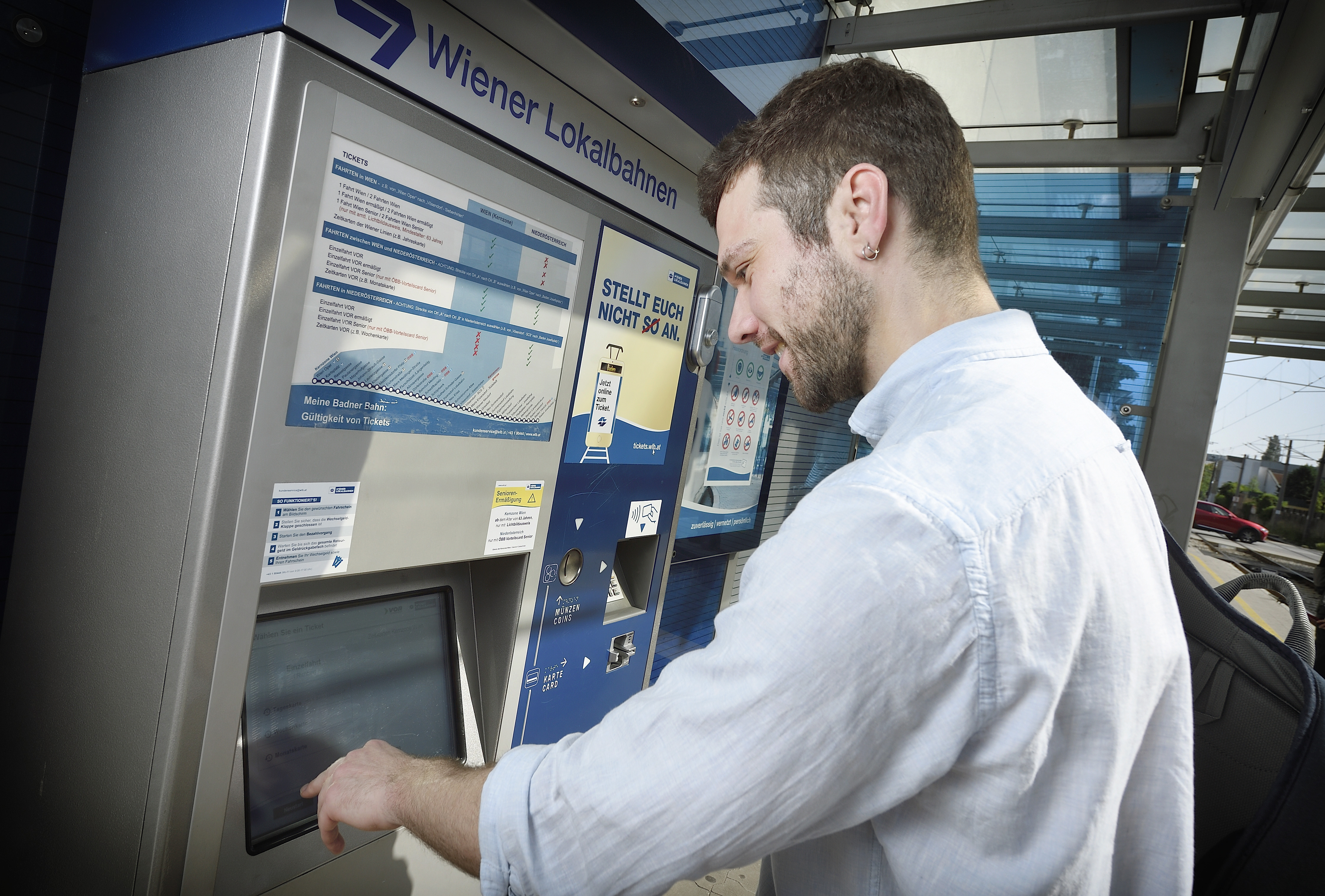 Fahrgäste unterwegs mit der Badner Bahn. Halltestelle Inzersdorf Lokalbahn, Ticketkauf beim Automaten in der Haltestelle