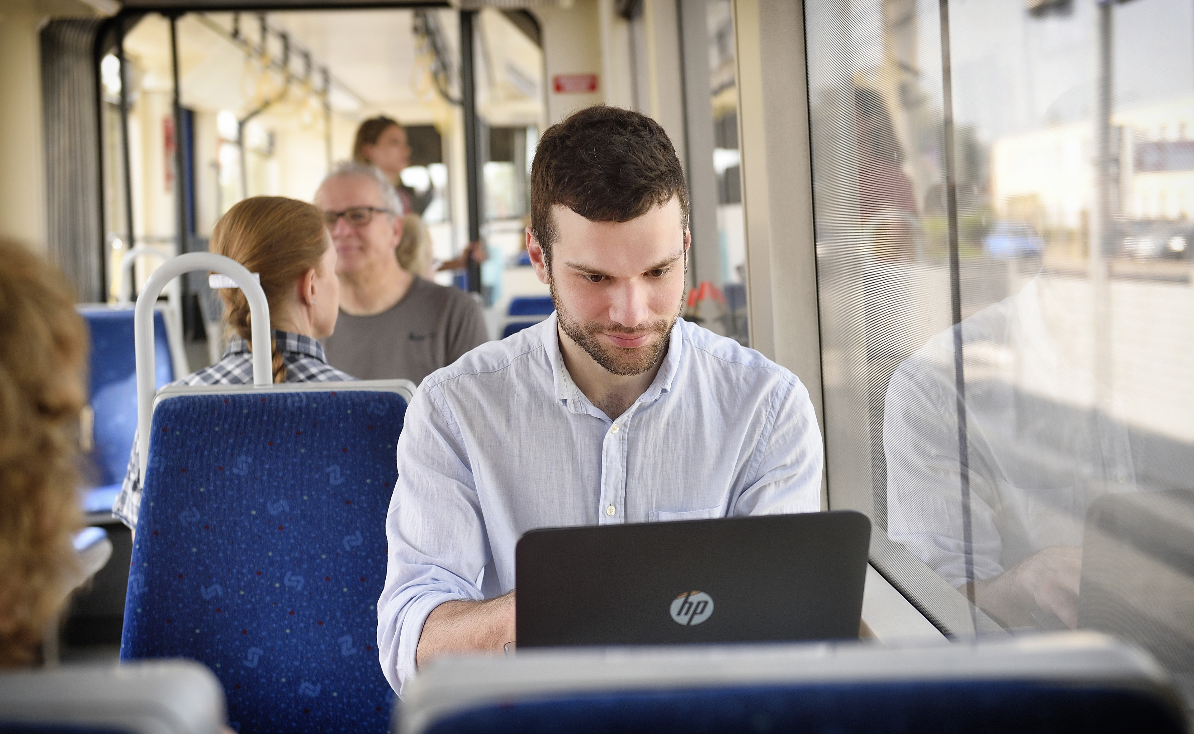 Fahrgäste unterwegs mit der Badner Bahn. Arbeit mit dem Laptop im Zug.