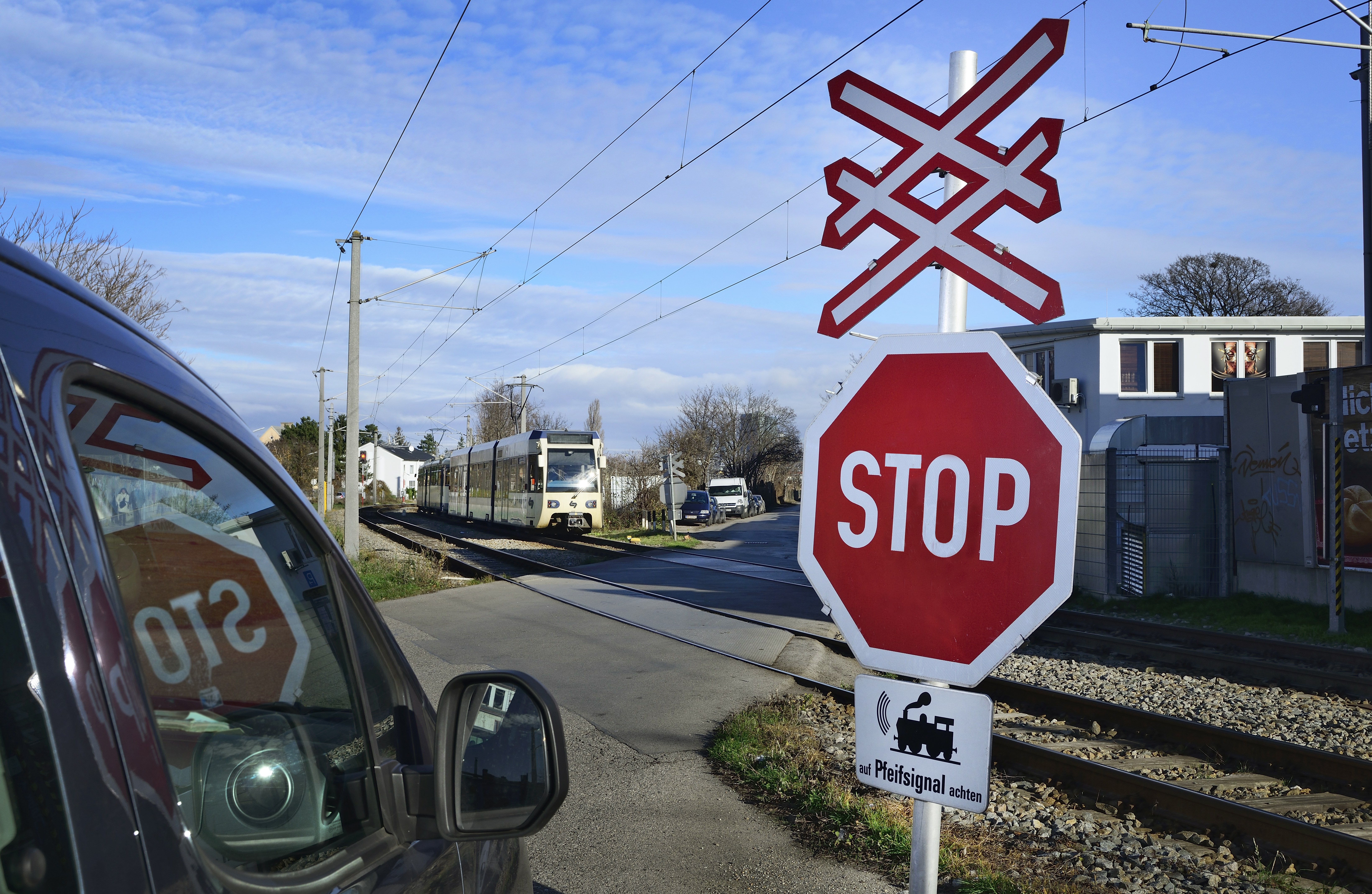 Garnitur der Badner Bahn überquert Eisenbahnkreuzung. Foto: WLB / Johannes Zinner
