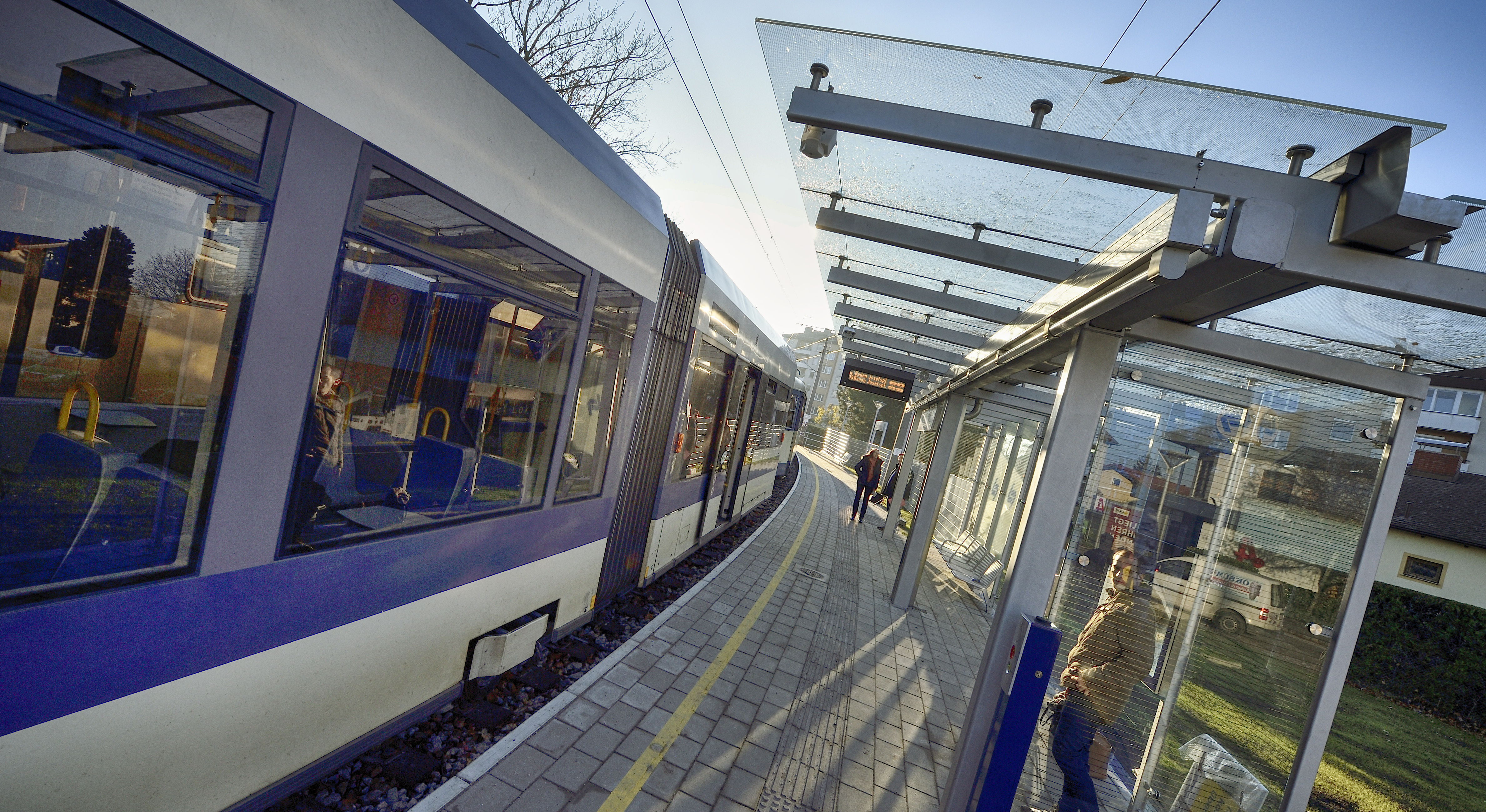 Badner Bahn in der modernisierten Haltestelle Pfaffstätten-Rennplatz. Foto: WLB / Johannes Zinner