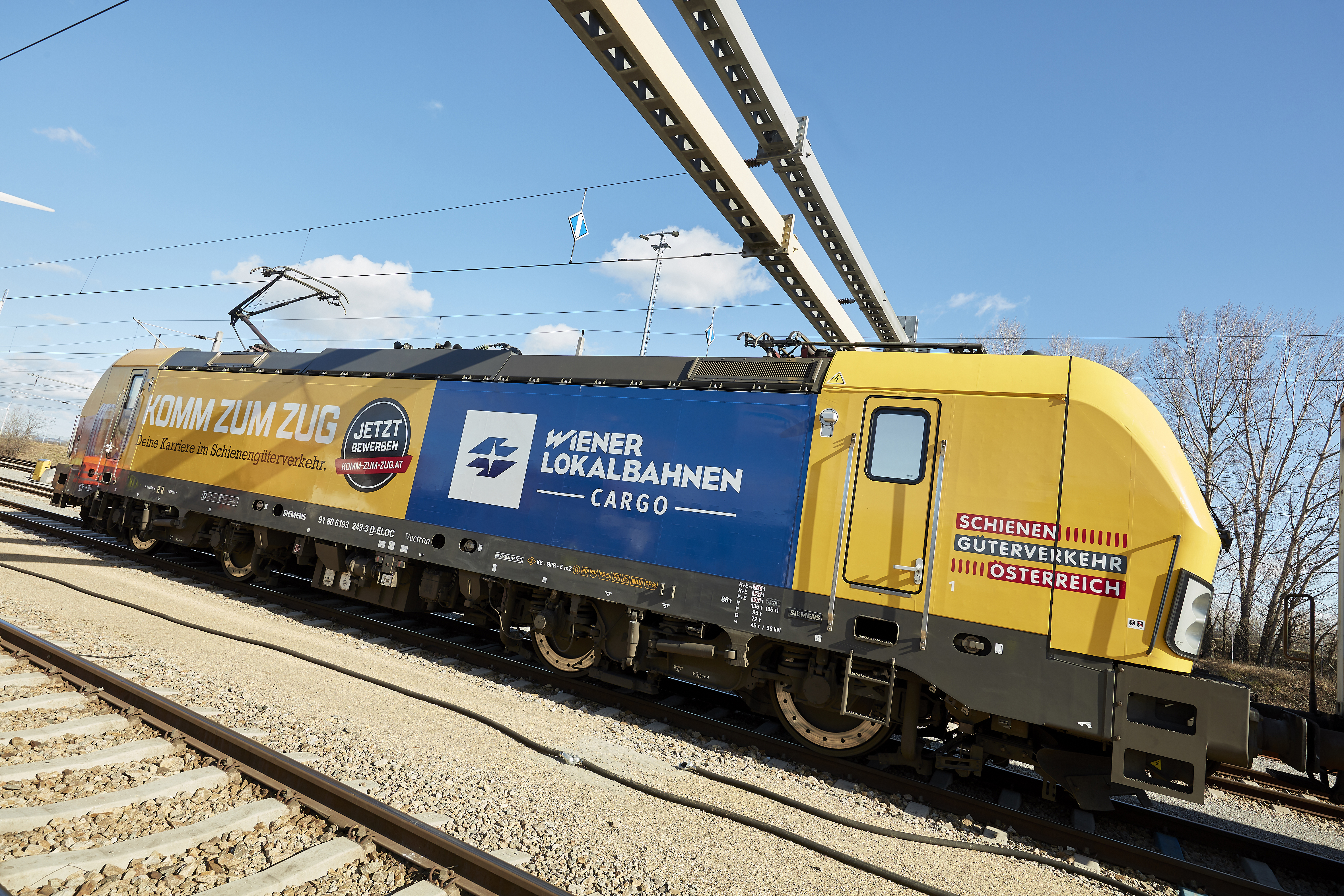 Die neu beklebte Lokomotive der Wiener Lokalbahnen Cargo bewirbt Jobs im Schienengüterverkehr. Foto: WLB / Thomas Topf