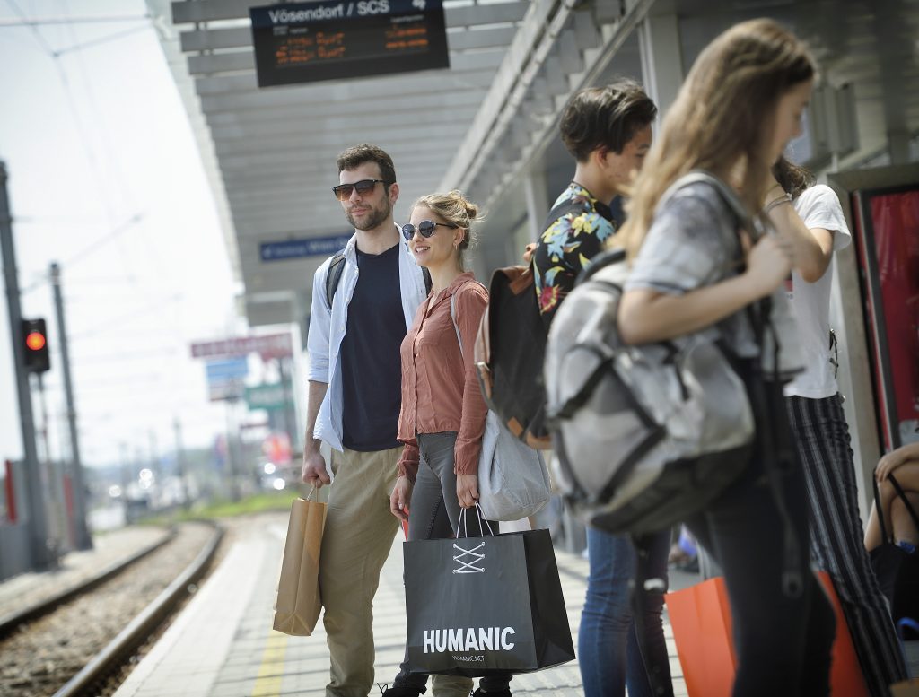 Fahrgäste unterwegs mit der Badner Bahn. Haltestelle Vösendorf / SCS