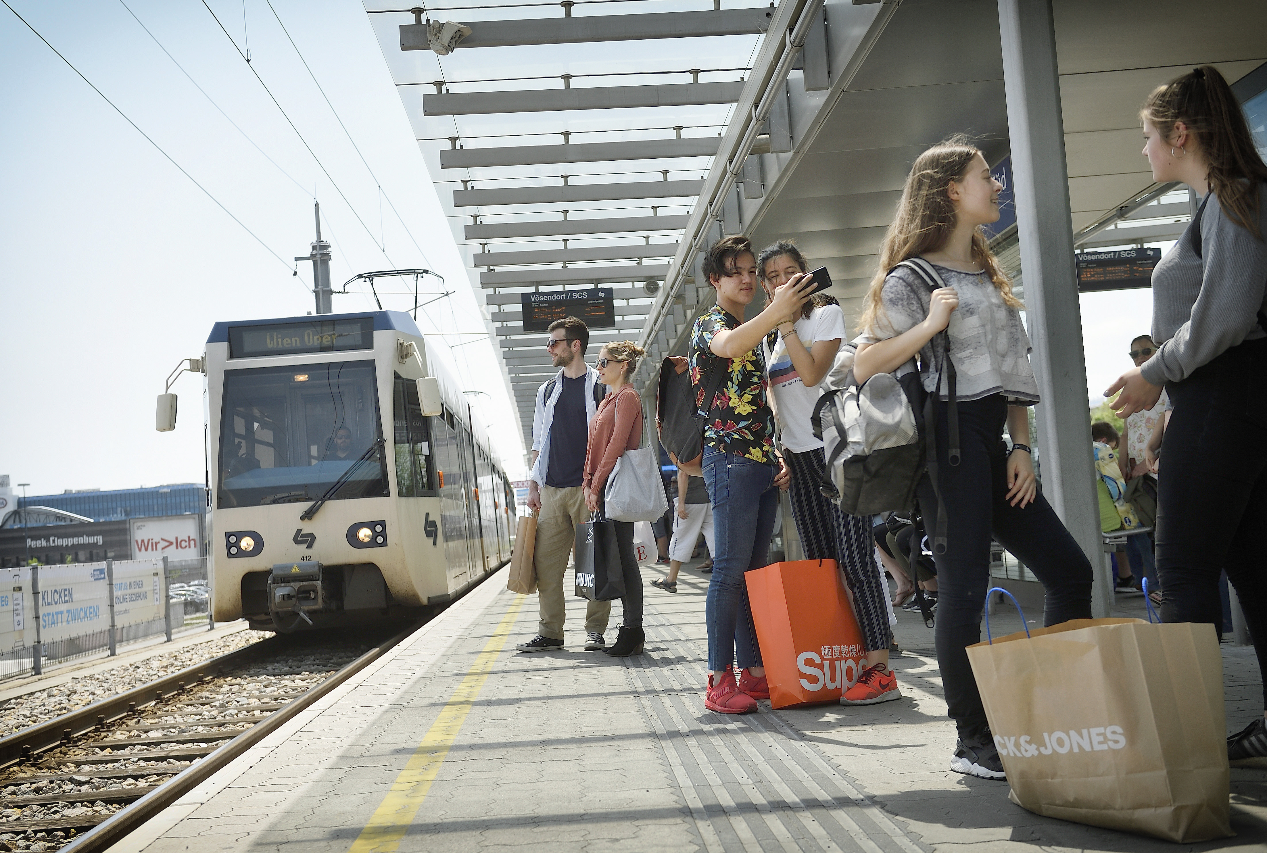 Fahrgäste unterwegs mit der Badner Bahn. Haltestelle Vösendorf / SCS