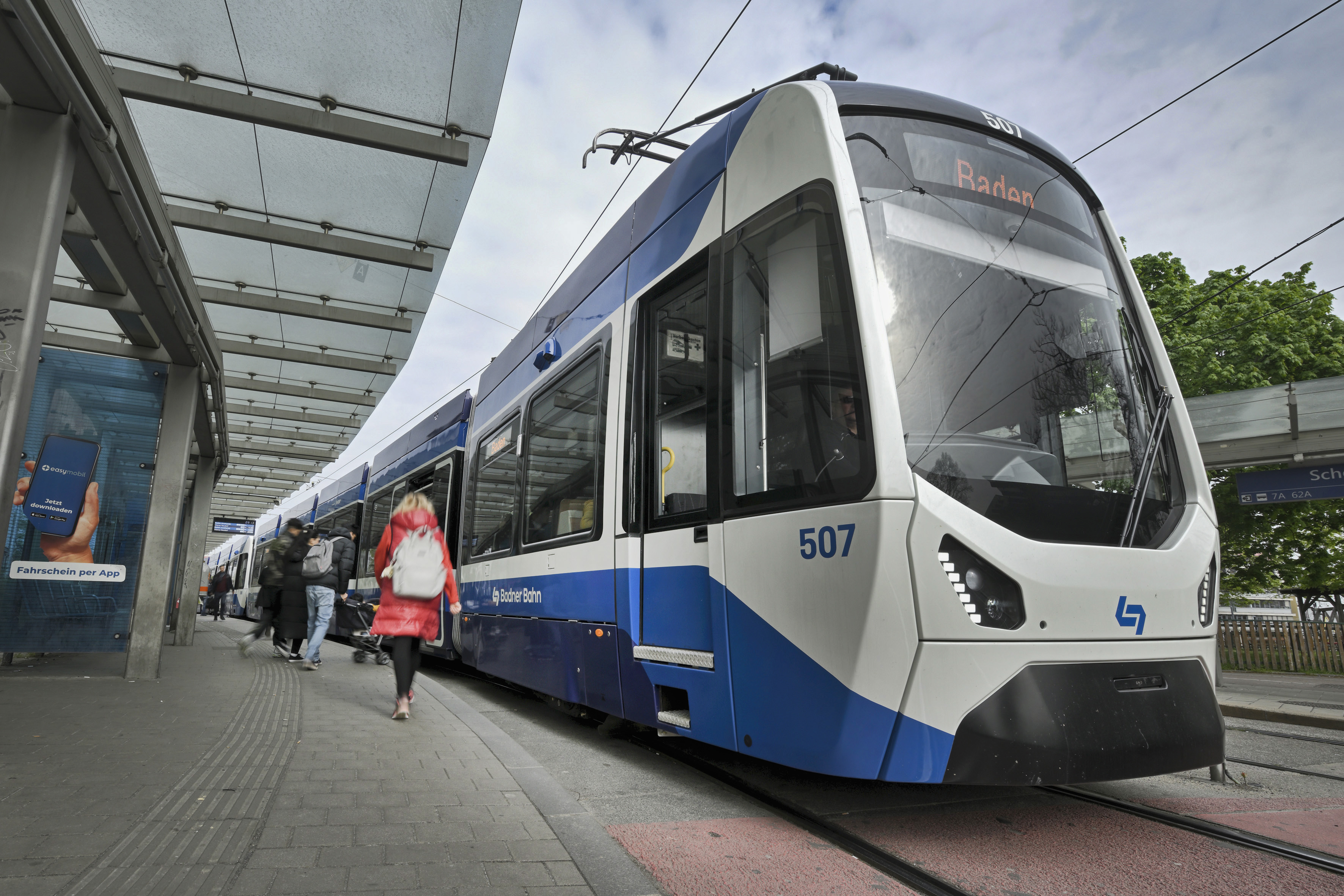 Der neue Zug der Badner Bahn. TW500 im Fahrgastbetrieb, Schedifkaplatz