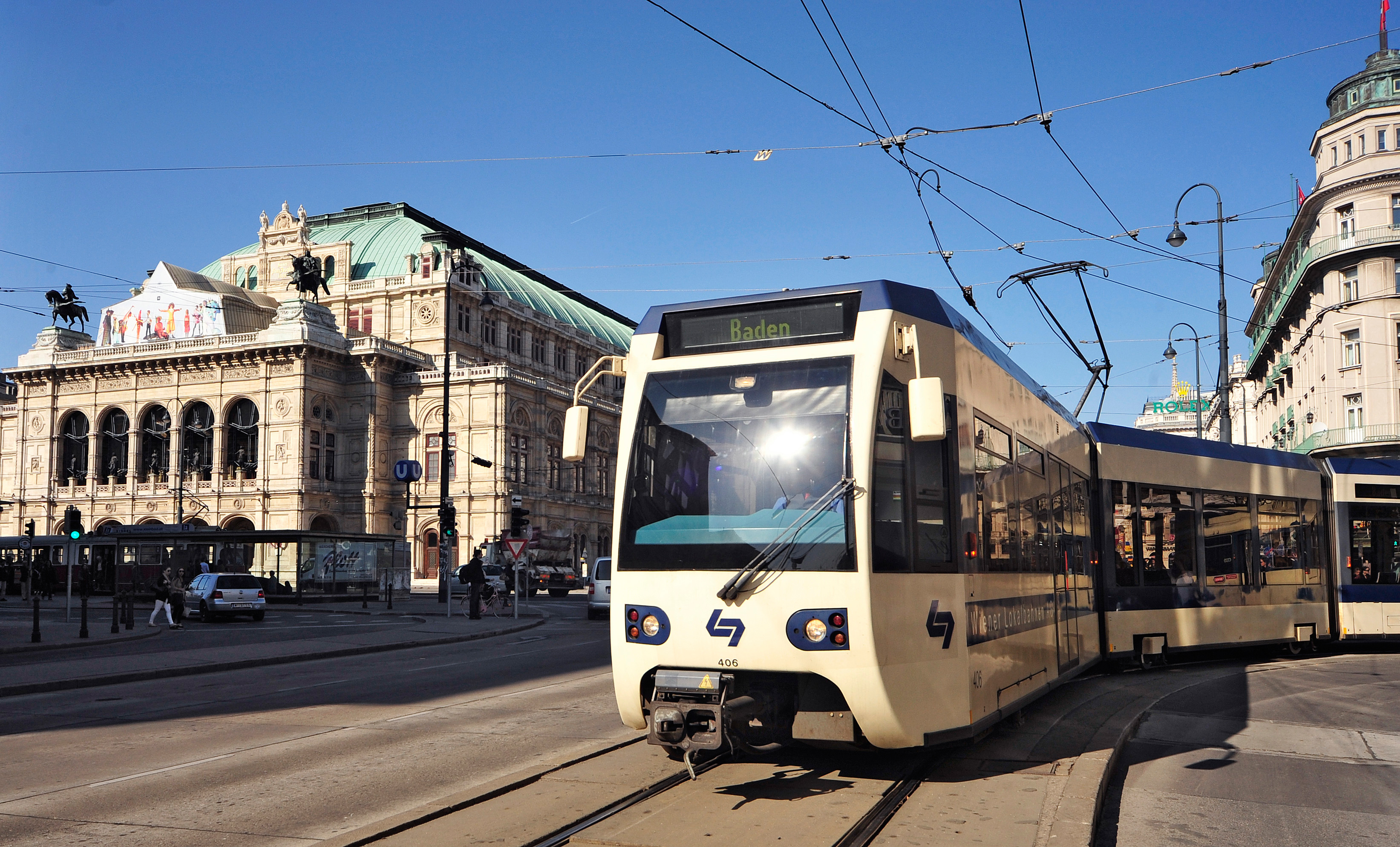 Badner Bahn vor der Staatsoper in der Wiener City Foto: WLB / Johannes Zinner