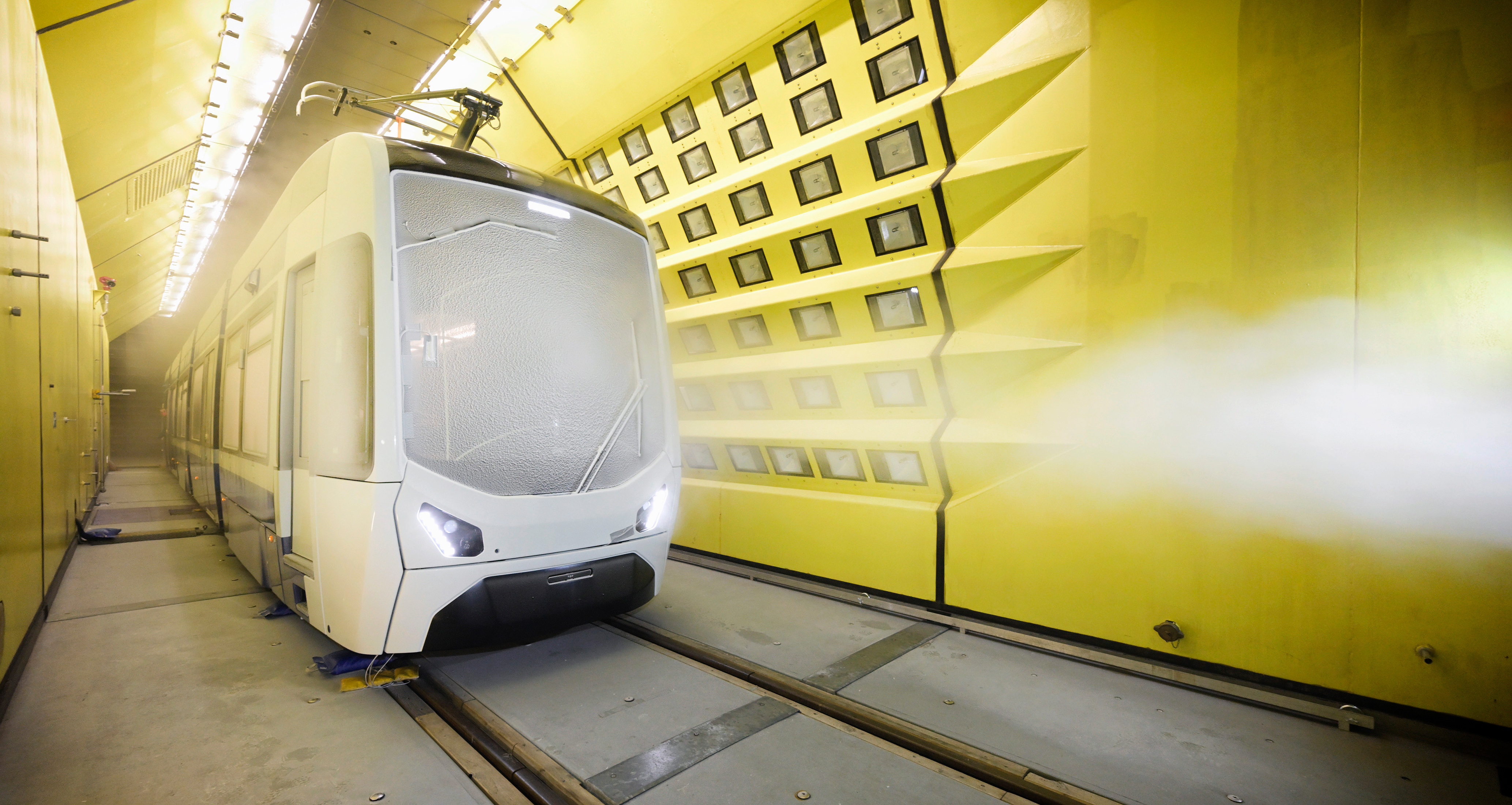 Der erste neue Zug der Badner Bahn wird im Klima-Wind-Kanal getestet. Foto: WLB/Zinner